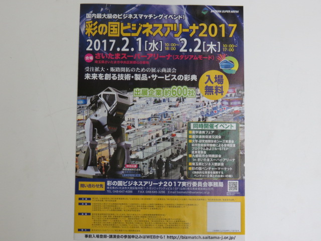 彩の国ビジネスアリーナ2017の出展します。2017年2月1日(水)~2日(水)です。 ブース番号はA-57・58です。 -