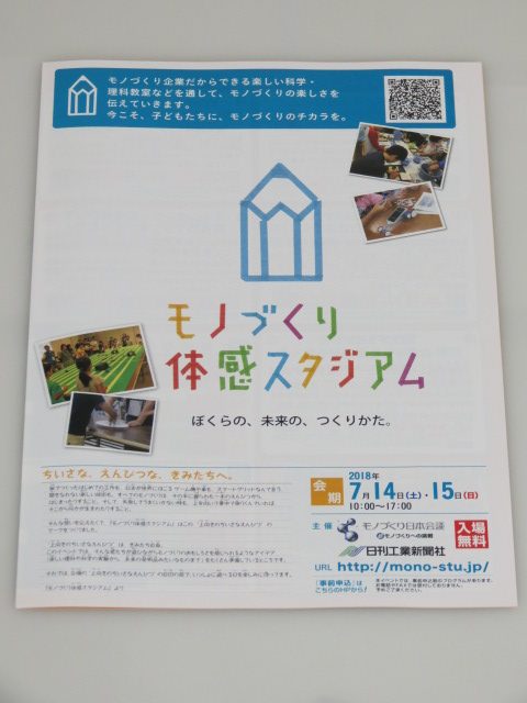 モノづくり体感スタジアムの開催まで、1ヶ月を切りました。 事前申込は6月12日(火)13:00~7月12日(水)12:00までとなっていますので、ご注意ください。(定数になりましたら期間内でも締め切りますので、お早目の申込をお願いします。) ※当日受付も... -