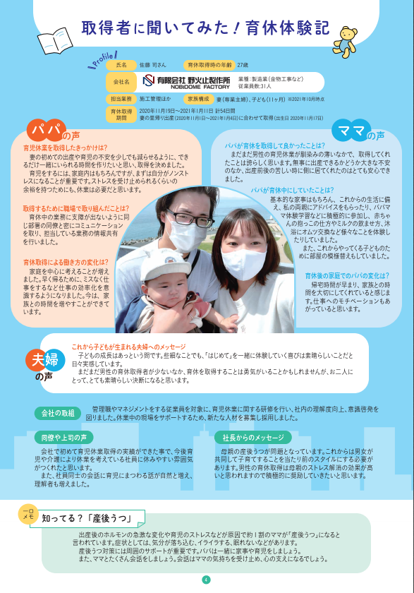 弊社の社員が埼玉県版 働き方改革ポータルサイト内のパパの育休取得ガイドに掲載されました。 PAGE4_danseiikukyuu_guideダウンロード -