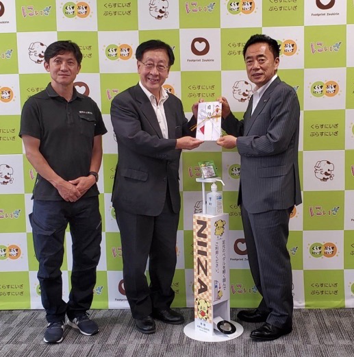 7月20日、新座市役所の並木傑市長に足踏みペダル式アルコール消毒噴霧スタンド「ワンフットくん」を2台、目録とともに寄贈しました。 新座市のマスコットキャラクターであるゾウキリンを組み込んだ可愛いデザインに仕上がりました。消毒液容器を手で触... -